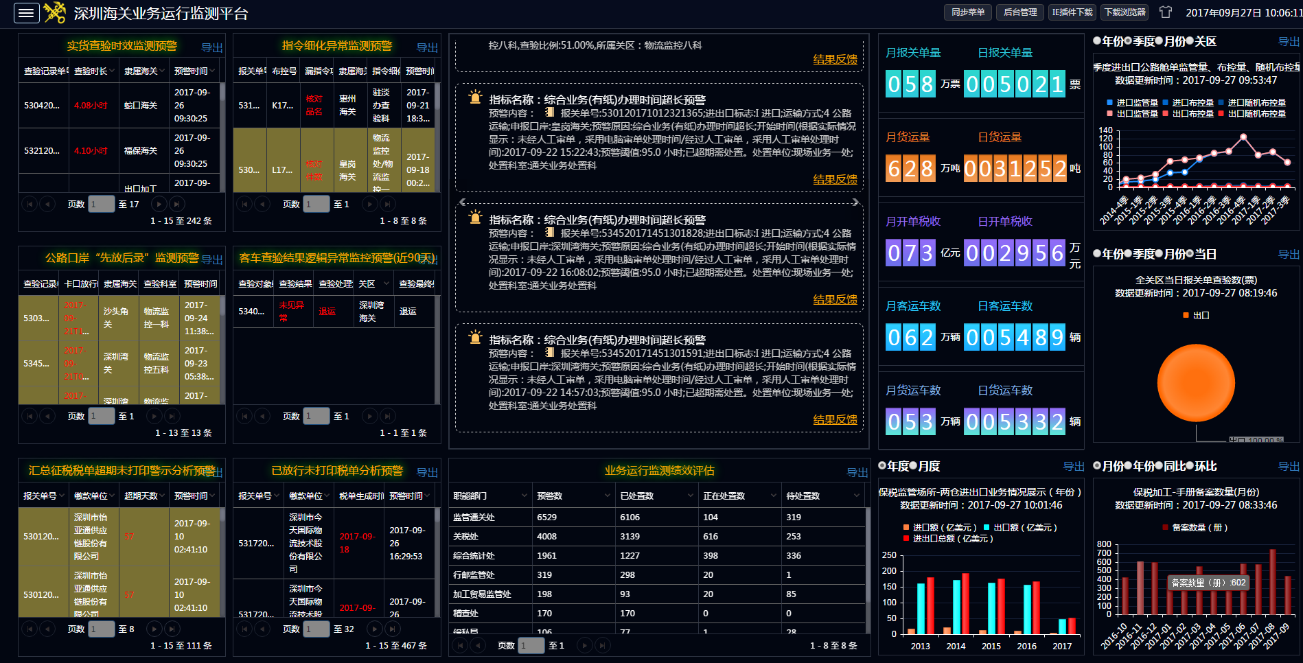 2017年6月14日,海關(guān)總署黨組研究決定啟動新一代海關(guān)信息系統(tǒng)(H2018系統(tǒng))建設(shè)工作。此次升級是在金關(guān)工程二期已奠定的強(qiáng)大基礎(chǔ)之上,面對新形勢、新任務(wù)和新要求,繼續(xù)堅(jiān)持“科技強(qiáng)關(guān)”戰(zhàn)略,加強(qiáng)了系統(tǒng)的集成整合、互聯(lián)互通。深圳海關(guān)結(jié)合關(guān)情、廉情,對職能管控難的問題,以問題和需求為導(dǎo)向,決定啟動深圳海關(guān)業(yè)務(wù)運(yùn)行監(jiān)測平臺升級建設(shè)工作。航通智能此次助力深圳海關(guān)業(yè)務(wù)運(yùn)行監(jiān)測平臺(以下簡稱平臺)建設(shè)工作,對平臺進(jìn)行功能完善和指標(biāo)補(bǔ)充,提高數(shù)據(jù)提取的準(zhǔn)確性和指標(biāo)設(shè)定的科學(xué)性,確保干預(yù)和處置的及時性有效性,實(shí)現(xiàn)關(guān)區(qū)智能管理方式的優(yōu)化轉(zhuǎn)變。