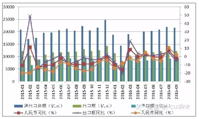 圖表 1 2015年1月-2016年9月我國進出口貿易逐月情況對比