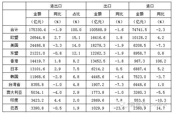 圖表 2 2016年前三季度中國前十大貿易伙伴進出口情況